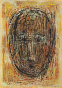 Vor dem Hintergrund einer schweren Erkrankung bekam die thematische Konzentration auf „Kopfbilder“ in ihrem jüngsten Werk eine neue inhaltliche Bedeutung, als Ahnung des Zukünftigen, als Auseinandersetzung mit der Form als auch mit der Metapher des Kopfes als Sitz des Verstandes, des Fühlens, des Denkens und als Vergewisserung über das menschliche Wesen und seine Eigenart. Ihre Kompositionen baut Karin Sakrowski motivisch verknappt, und betonte flächenhaft aus wenigen assoziativen Dingen zu metaphysischen Bildkonstruktionen, deren Farbigkeit durch eine erdige Grundkomposition, ergänzt durch leuchtendes Blau, Rot oder Gelb, gekennzeichnet ist.