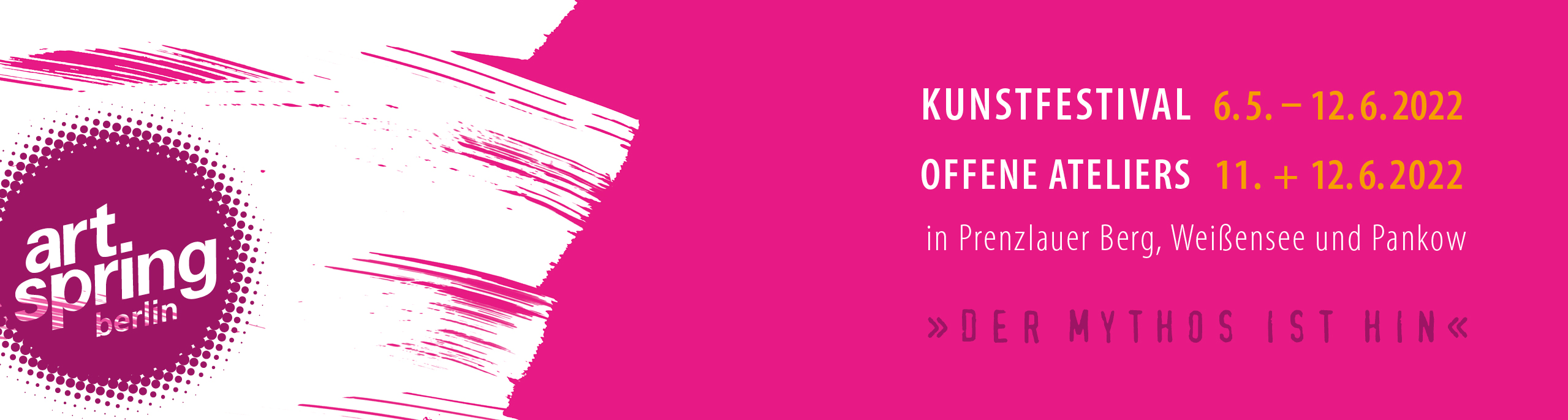 Vom 6. Mai bis 12. Juni 2022 steht das artspring berlin Kunstfestival im Mai und Juni unter dem Motto „der mythos ist hin“.