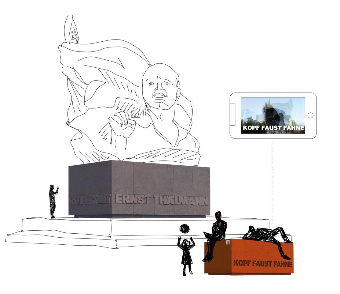 Der Entwurf sieht vor, auf dem Denkmalplatz fünf vielfach nutzbare, farbige Betonelemente, die den Denkmalsockel maßstabgerecht verkleinern, zu platzieren. Sie lockern einerseits formal die strenge Struktur des Platzes auf, ziehen Besucher_innen an und laden zum Verweilen ein. Über die Beschriftung der Sockel mit poetischen Schlagwörtern werden inhaltliche Bezüge zum Denkmal und seinen historischen Hintergründen hergestellt und ein Interesse geweckt, sich mit dem Ort intensiver auseinanderzusetzen. Einen wesentlichen Teil des Entwurfs bilden sowohl künstlerisch als auch inhaltlich überzeugende Filmessays, welche die Thematik aus verschiedenen Perspektiven beleuchten, den verschiedenen historischen Betrachtungsweisen Referenz erweisen und zugleich einen Gegenwartsbezug herstellen. Die Filme werden der Öffentlichkeit über QR-Codes vor Ort sowie über weitere Vermittlungsebenen zugänglich gemacht. Einer dieser Kurzfilme soll gemeinsam mit Anwohner_innen und Nutzer_innen des Thälmann-Parks erarbeitet werden.