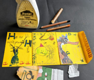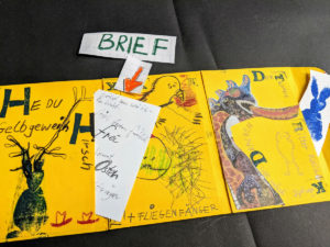 Als “Aufwärm Projekt” stellen wir ein LEPORELLO / FALTBUCH aus Briefumschlägen her, in dem unterschiedliche Materialien (eigene Zeichnungen, Texte, vorgefundene oder eigene Fotos) zusammengestellt und collageartig kombiniert werden. In die Öffnungen der Briefumschläge könnt Ihr geheime Botschaften verstecken oder Euer Lieblingsfoto aufbewahren.